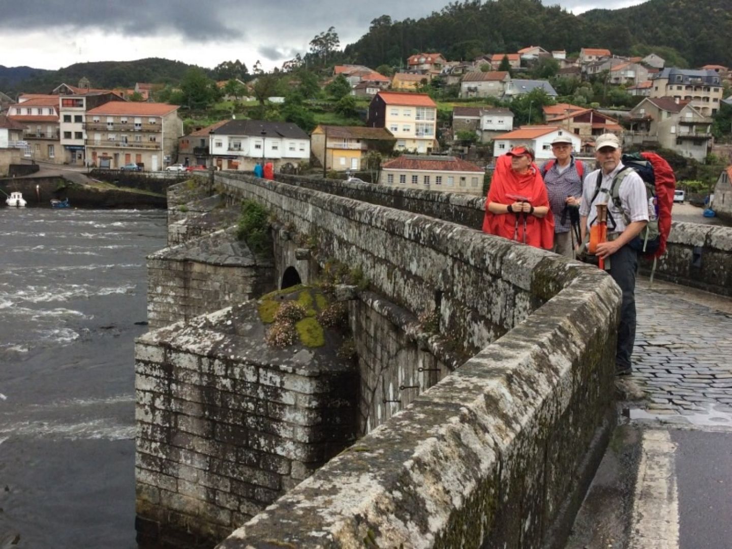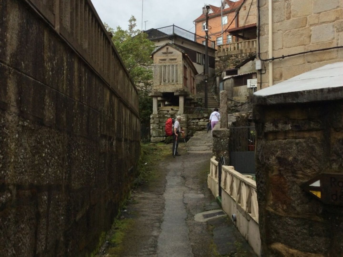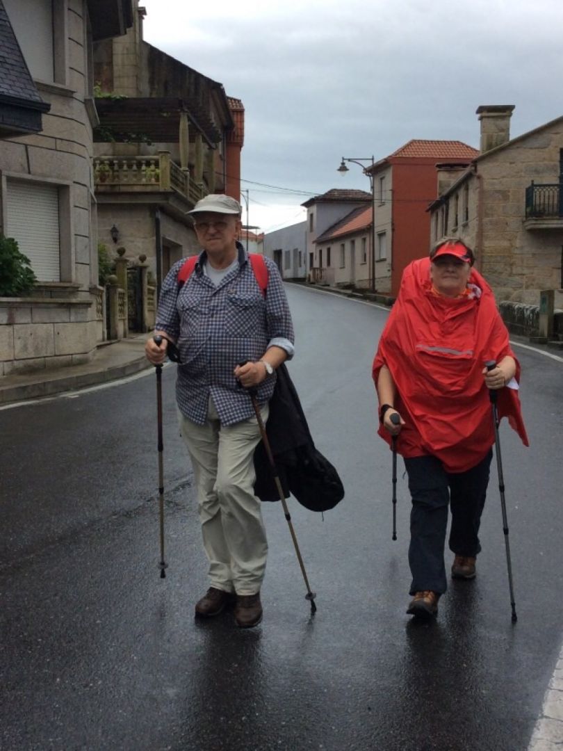 Tjašine napovedi so bile pravilne. Dezevalo je celo noc, tudi zjutraj in pihati je zacelo. Po zajtrku (hospitaljera nam je pripravila biskvitke, kavo, kakao, ... z voscilom “buen camino”) s polno bojno opremo za dez na pot (Nina: zuljev nimamo - nekateri si oblepijo noge kar vnaprej, jaz pa po receptu neke starejse ameriske romarke pod pohodne nogavice obujem najlon kratke nogavicke - vse deluje).