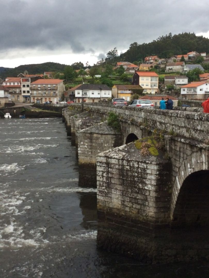 Pot gre najprej posteno v breg (le kako bi lahko bilo drugace), in tako velikokrat danes :). Nekaj casa mi preganjamo oblake, pa spet oblaki nas. Vsake toliko celo preneha dezevati. Temperatura je odlicna za hojo, sonce pa ze malo pogresamo. Po prvem hribu na poti se ustavimo v kraju Arcade na kavi in malici. Pot se tudi od tu naprej vije navzgor in skozi gozd, res lepo, evkaliptus krasno disi. Po spustu z drugega hriba se ustavimo v precej posebnem “baru” (ce se temu sploh lahko tako rece), kjer nam “gospodar” postreze s kavo, cajem, sadjem v kosari. Pod nogami muce in psicki, okrog nas pa vsaj 20 peregrinosov od vsepovsod. In prav takrat se trikrat zapored vlije kot iz skafa. Od navdusenja da smo pod streho, narocimo “orujo de hierbas” in ko ploha preide, odmasiramo na zadnjih 6km danasnje etape do vecjega kraja Pontevedra. Vsega skupaj se je nabralo vec kot 20km (po vodniku 18km). Smo v lepem albergu Aloxa (beri “aloša”), kjer smo odkrili tudi lavadoro in secadoro, ki smo ju navduseni uporabili. Potem še na menu peregrino in nekateri nad perilo, Breda in Pavel pa proti centru na ogled posebne kapele, posvecene peregrinosom. Tloris ima obliko znamenite skoljke, vse ostalo pa je tudi v enakem stilu (Marija ima ogrinjalo, tipicno za peregrinose, prav tako pokrivalo s skoljko, romarsko palico z bucko. Tudi angelcki imajo romarske palice, krizev pot je opremljen s skoljkami, tudi kropilnica je v obliki skoljke).