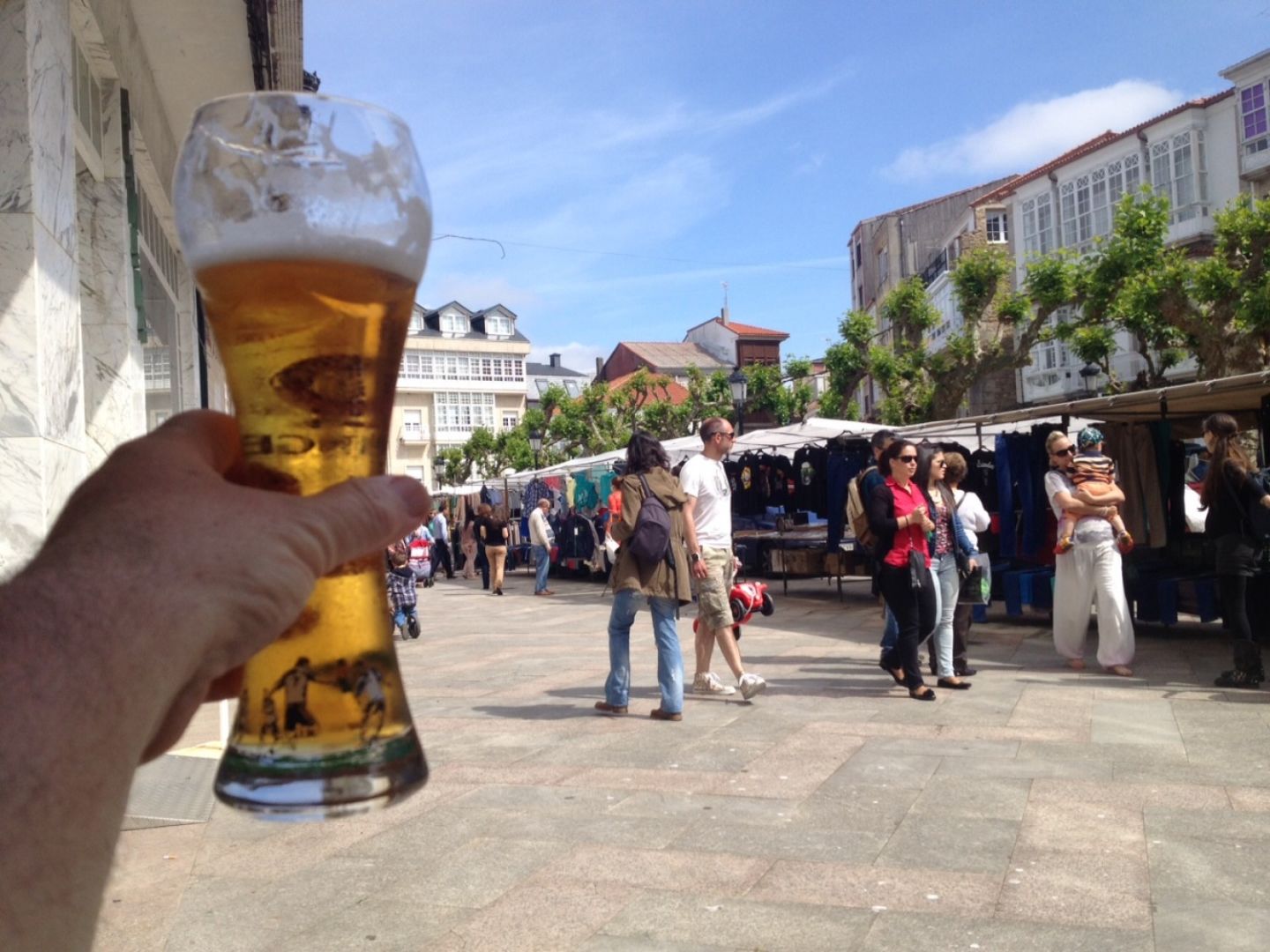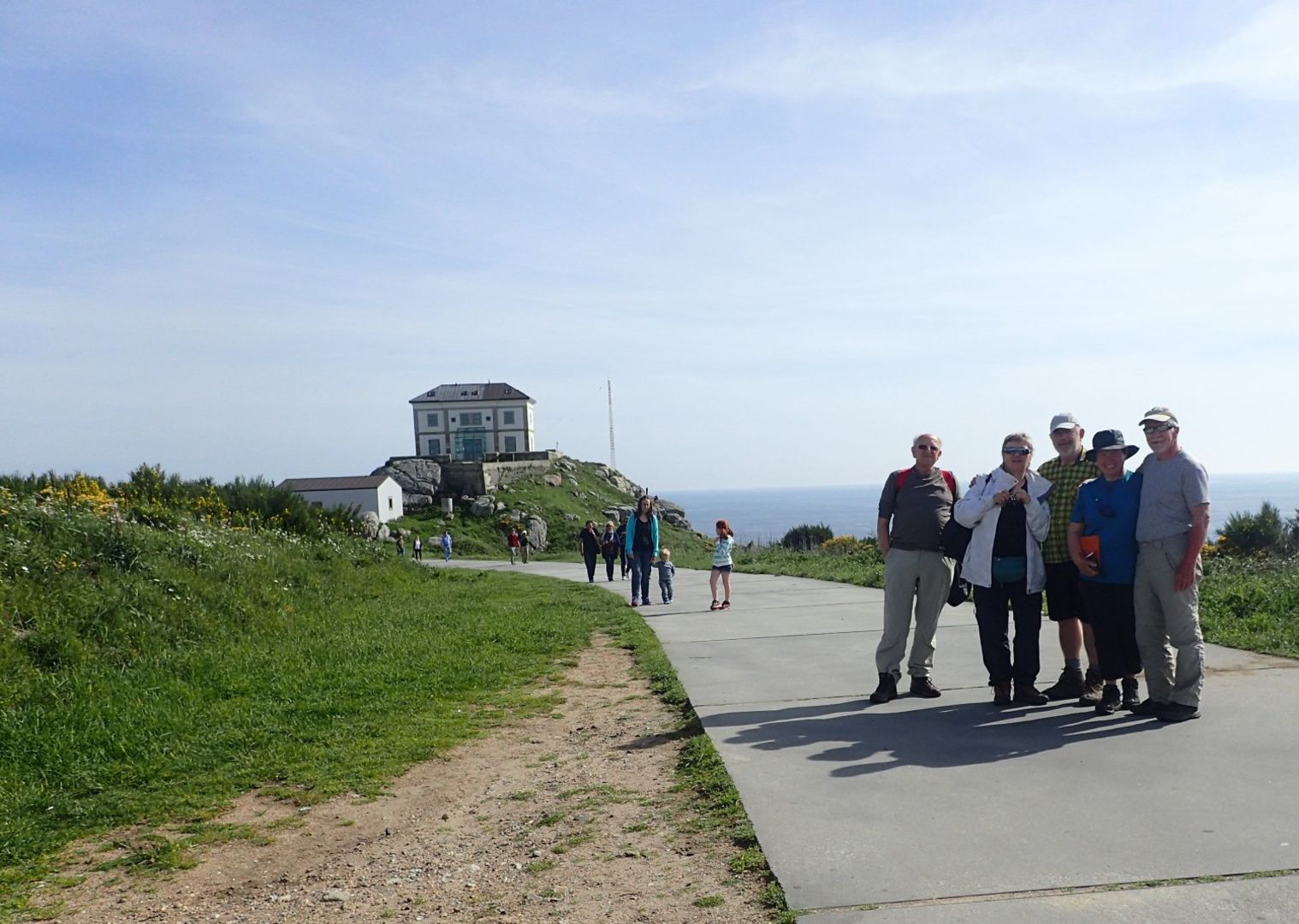 Zaradi pomote, zvonila je ura na telefonu soseda in ne Pavla, sva vstala že ob 6h in nato odšla še na zajtrk v “hotel” Horreo: dvojna kava z mlekom in velik sendvič - bocadillo s pršutom. Sledili so pozdravi s kolegi, s katerimi se srečujemo na poti. Med njimi je tudi mešanka Italijanka od španske mame, živa manjša punca kakih 35 let, v športni obleki, ki jo je bilo prejšnji dan polno na vseh krajih in ki je z nama prehodila zadnji del poti. Pavel jo je namreč s svojo itlijanščino pritegnil v pogovor. Začelo se rumenegaje šele daniti, ko sva bila na poti, zato ni čudno, da sva kmalu po začetku zgrešila pot in odšla po razdrapanem asvaltu navzdol k reki Jallas in ne v hrib proti Hospitalu. En km več ali manj pri teh okoli 35 km dolgih turah se ne pozna. Nato sva lezla v hrib na višino kakih 370m, nakar se je teren v glavnem zravnal. Precej uhojena in na delih s peskom nasuta cesta se je vila med gozdovi, po travnikih, v objemu bujno cvetočega grmičevja. Celi hribi so porastli z njim in pogled na to rumeno pokrajino je prelep. Po kakihg 6h sva pprišla na rob planote, s katere sva prvič zagledala Atlantik. To je bilo pod Monte Brens, nad obmorskim krajem Cée. Pogled je kvarila le velika ploščad v morju za razskladanje in večj železarna. Spustila sva se proti morju in se v Cée-ju parkirala pred restavracijo za pivo in kavo. Pred nama je bil nedeljski sejem in mimohod ljudi je bil zanimiv. Potem sva se prebila na drugi konec sejma in si privoščila čokoladni churos (testo za krofe stisnjeno v oblio klobase in potopljeno v čokolado). Vroče pristaniško mesto Corcubion, v katerega se je prelil Cee, sva nato gledala od zgoraj, saj sva se morala do drugega zaliva na poti (Estorde) dvigniti čez greben. Od tam naprej sva v vročini tolkla asvalt ali hodila ob robu ceste. Spet vzpon, tokrat zadnjii pred Finisterro v daljavi. Ko sva se spuščala, je Pavel prepoznal zaliv, v katerem se je kopal 2009 in kjer so ga našli člani njegove družine, ko so ga prišli pobrat z avtom po opravljenem Caminu frances (900km). Proti Fiisteri sva jo nato mahala v prijetnem gozdičku po s kamnitimi ploščami tlakovani poti v zalivu Langosteira. Poklicala sva Dragotovo Bredo, ki je s Pavlovo Bredo in Tadejem že prišla z avtobusom v Finisterro, da se srečamo. V pričakovanju, da nama pridejo naproti, se je Drago šel skopat v dolge hladne valove peščene plaže. Plaža je bila polna odmrlih školj, a le ena med njimi je bila Jakobova in ta je šla v Dragotov nahrbtnik. In ker ni bilo nikogar nasroti, sva s Pavlom prehodila še 2 km do mesta, kjr so naju pričakale kamere v rokah pričakovalcev. Dalje beri prejšnji report