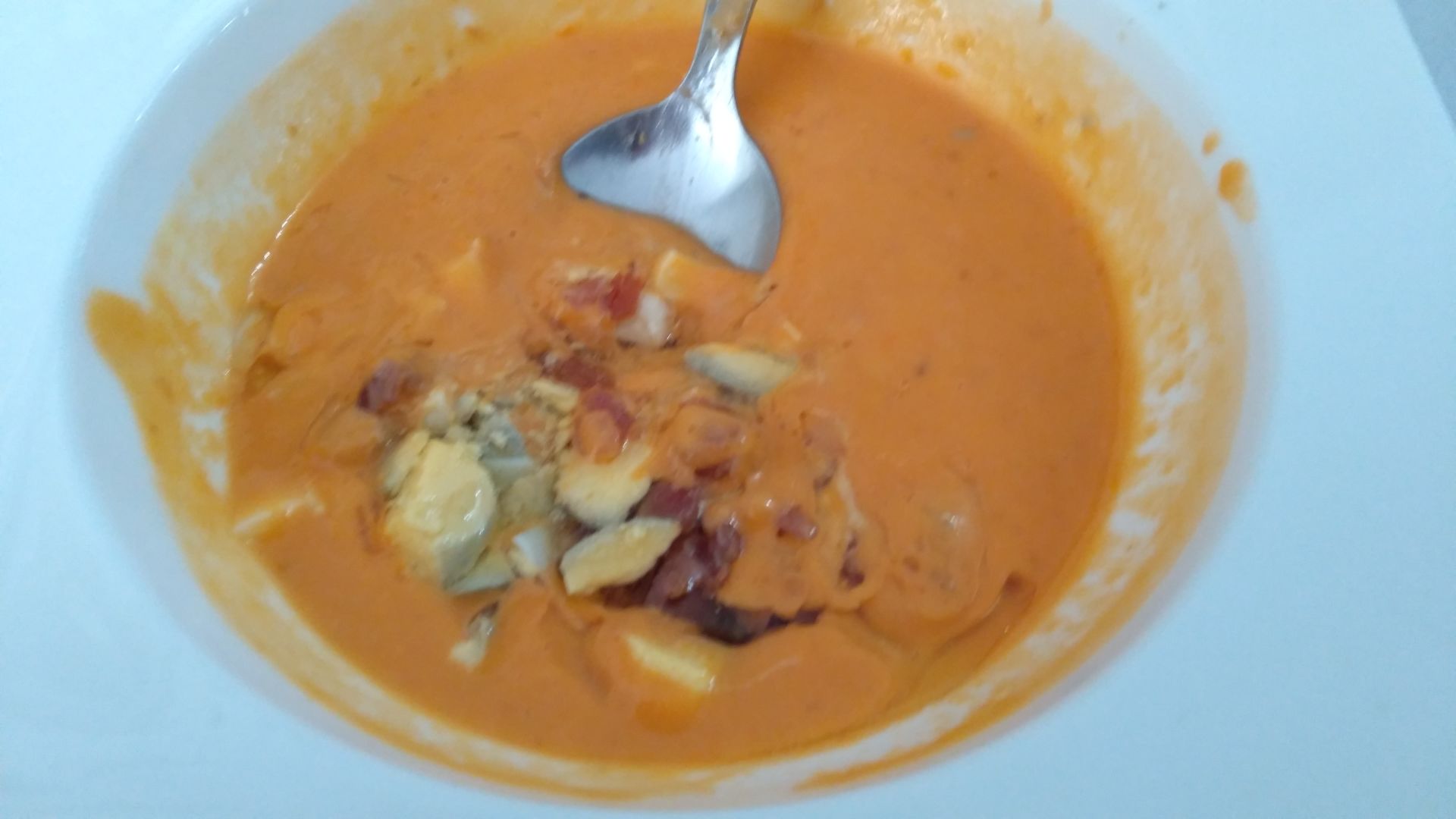 Za kosilo jeva kar dobro. Vceraj je bila za predjed solata, Pavel je vzel zeleno jaz pa tisto ta drugo, za katero se je izkazalo da je konkretno velika porcija francoske solate, ki sem jo komaj pojedel. Za glavno jed pa zrezek in pomfri. Danes sva za predjed narocila juho, ceprav nisva razumela kaksna bo. Dobila sva hladno juho iz paradiznika in cesna - Salmorejo.