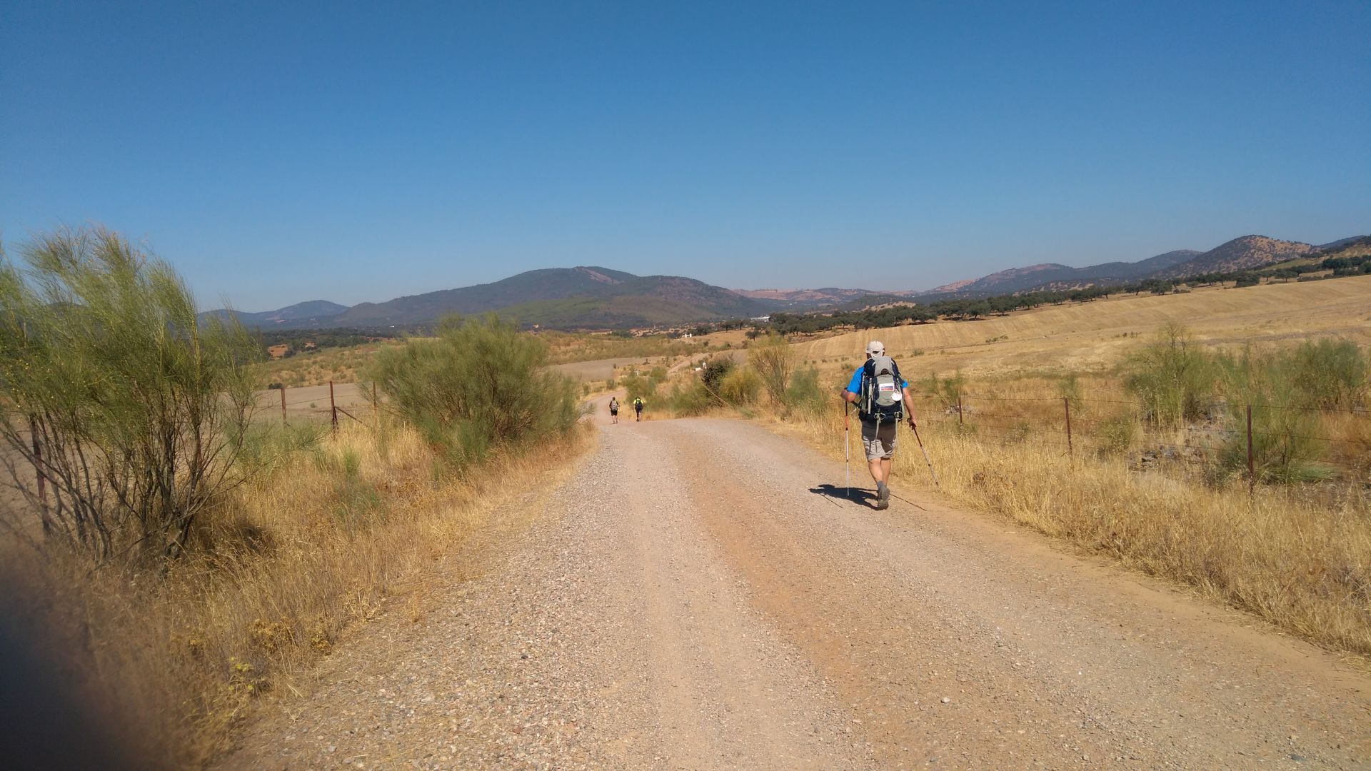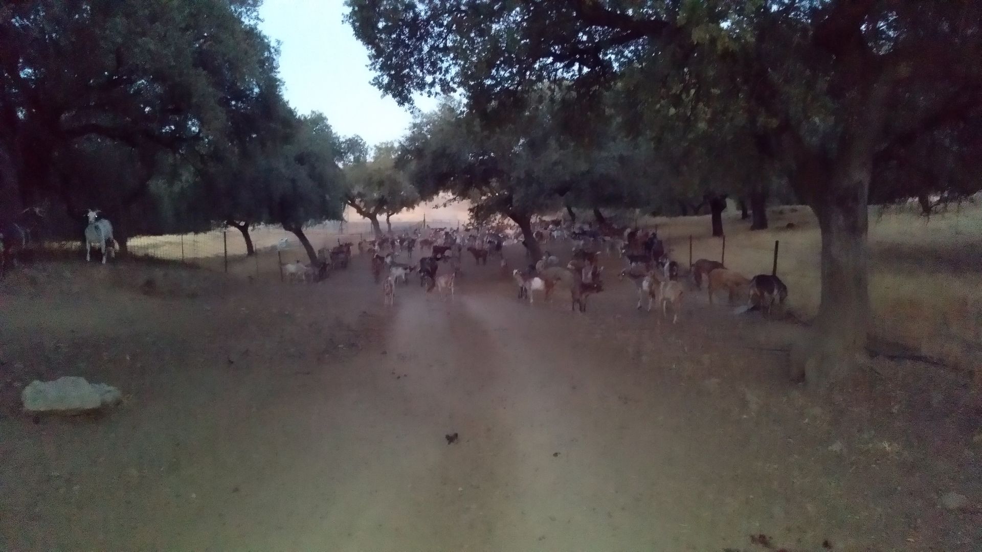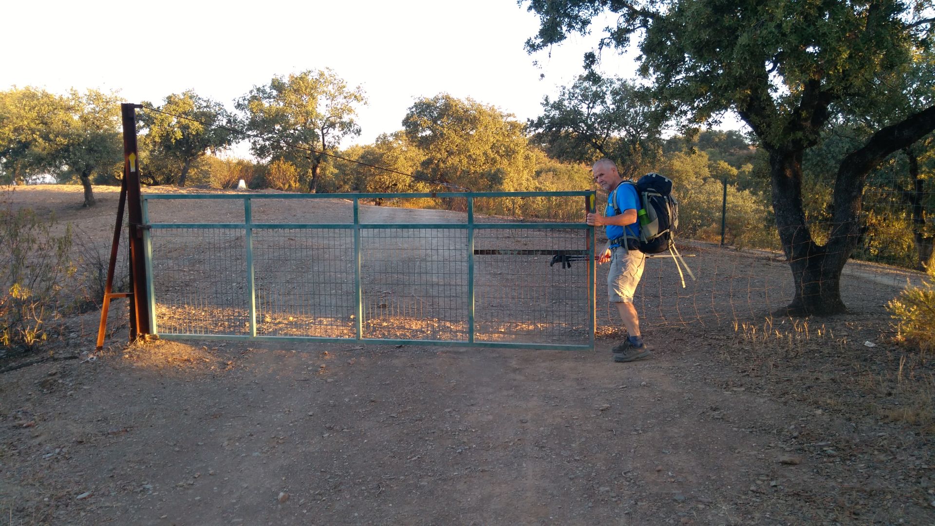 Na zacetku je bila danes pot malo slabo oznacena, parkrat sva se morala obrniti na gps. Veckrat sva si morala odpreti vrata v kaksni ograji. Se zjutraj v temi so naju pri neki hisi oblajali psi - sva se jih kar malo ustrasila. Malo kasneje pa je pred vrati na cesti cakala creda koz - te so se zelo prijazno umaknile. Po 15km sva prisla do vasi El Real de la Jara, kjer si je Pavel privoscil kavo, oba pa nektarine in piskote. Tu je bil ze tudi albergue, vendar sva imela se nekaj moci in se odlocila nadaljevati s potjo. Ravno ko sva se odpravljala naprej, so za nama prihiteli francozi s katerimi sva bila v albergu, in nama prinesli polnilec za mobitel, ki sva ga pozabila. Po kaksnem kilometru sva zapustila naravni park Sierra Norte, po katerem sva hodila zadnji dan. Danes je bila hoja po soncu bolj prijetna, saj je pihjal prijeten veter. Ob pol enih sva po nadaljnih 13km prisla do hotela ob avtocesti. Do naslednjega albergua v Monesterio je se 9km, zato sva sklenila da se ustaviva tukaj kljub visji ceni.