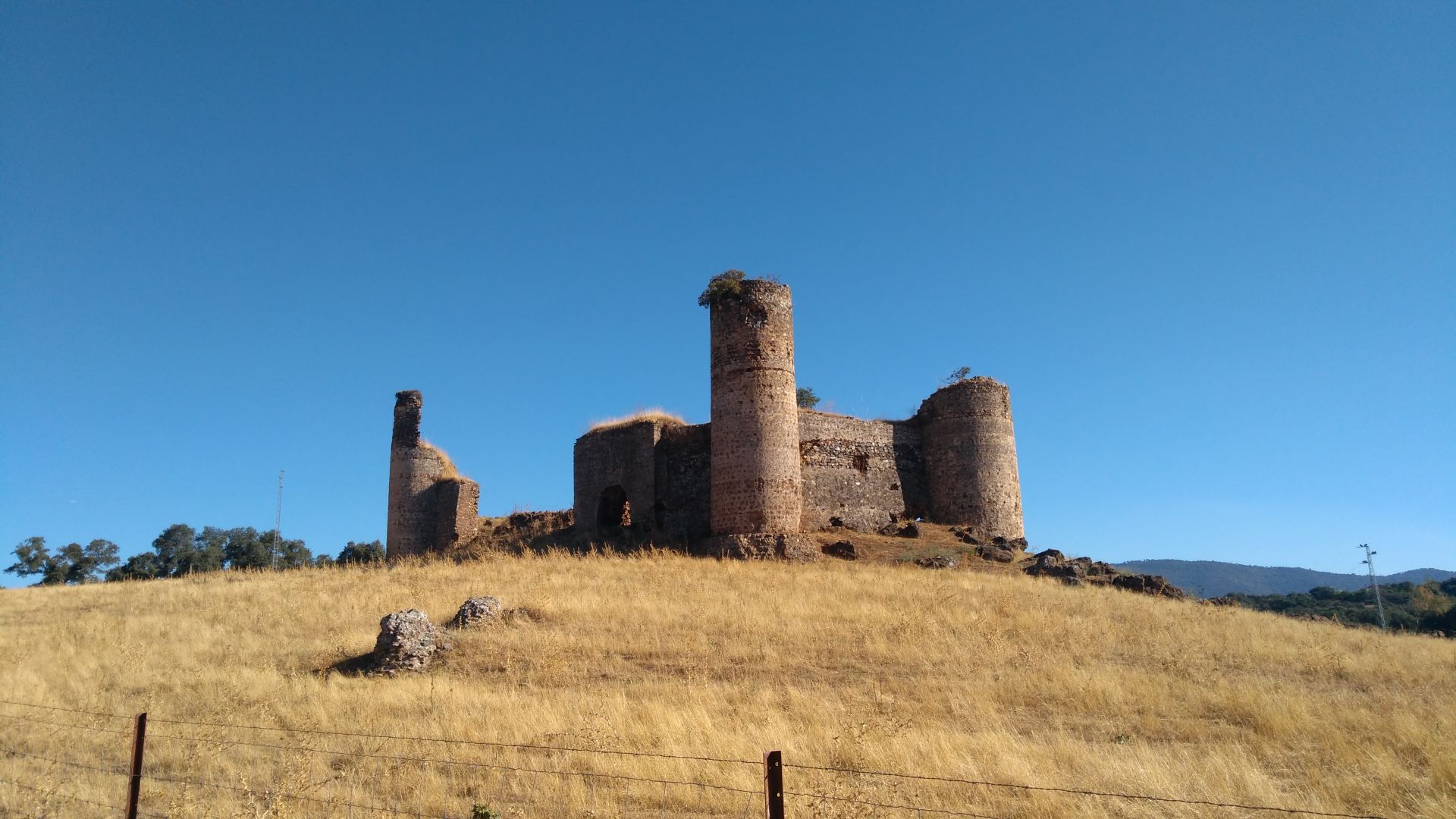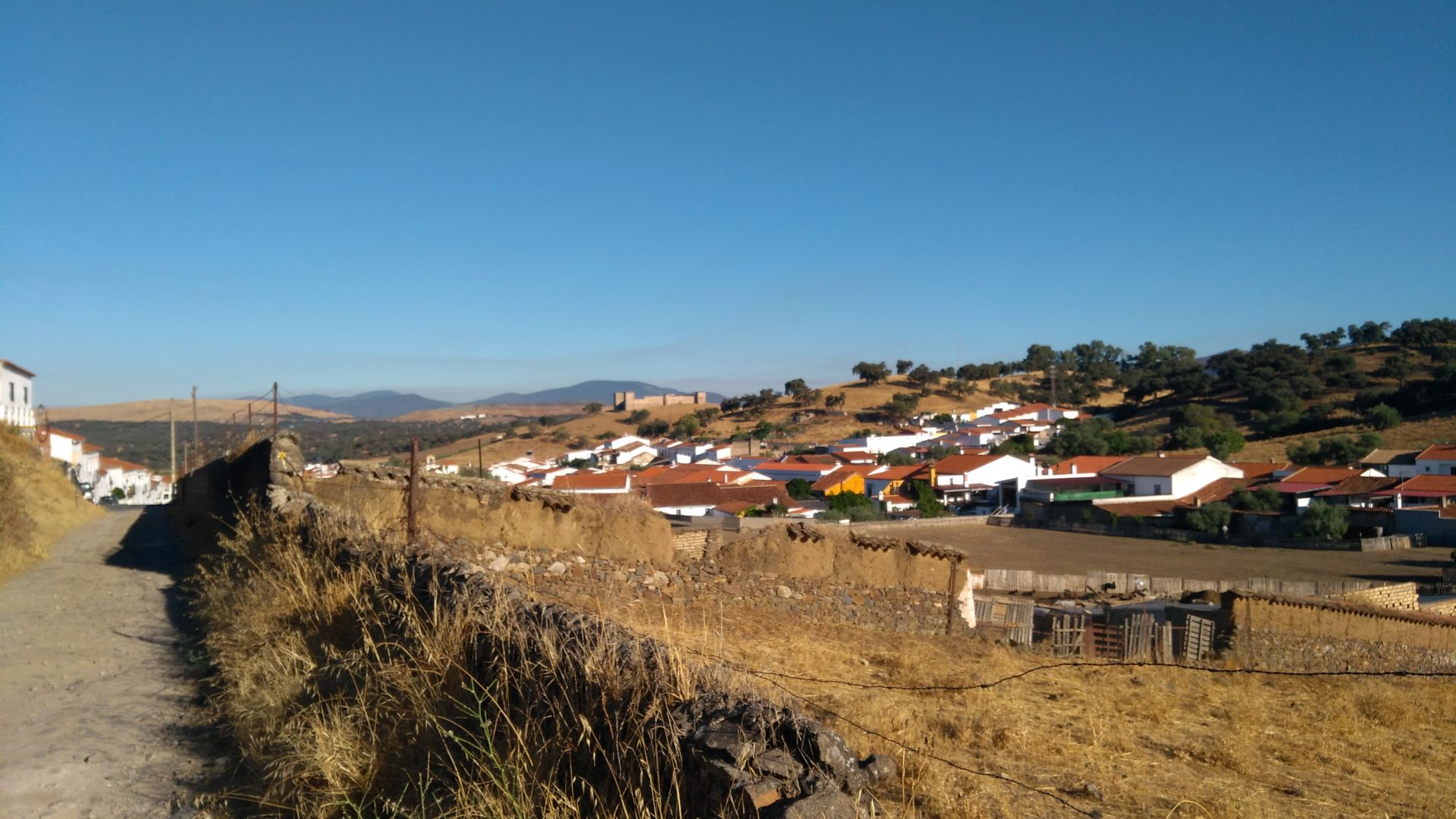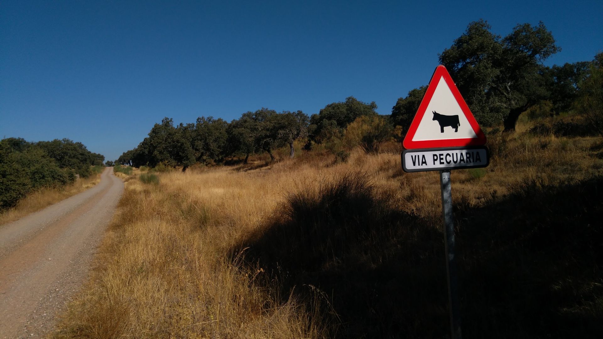 Na zacetku je bila danes pot malo slabo oznacena, parkrat sva se morala obrniti na gps. Veckrat sva si morala odpreti vrata v kaksni ograji. Se zjutraj v temi so naju pri neki hisi oblajali psi - sva se jih kar malo ustrasila. Malo kasneje pa je pred vrati na cesti cakala creda koz - te so se zelo prijazno umaknile. Po 15km sva prisla do vasi El Real de la Jara, kjer si je Pavel privoscil kavo, oba pa nektarine in piskote. Tu je bil ze tudi albergue, vendar sva imela se nekaj moci in se odlocila nadaljevati s potjo. Ravno ko sva se odpravljala naprej, so za nama prihiteli francozi s katerimi sva bila v albergu, in nama prinesli polnilec za mobitel, ki sva ga pozabila. Po kaksnem kilometru sva zapustila naravni park Sierra Norte, po katerem sva hodila zadnji dan. Danes je bila hoja po soncu bolj prijetna, saj je pihjal prijeten veter. Ob pol enih sva po nadaljnih 13km prisla do hotela ob avtocesti. Do naslednjega albergua v Monesterio je se 9km, zato sva sklenila da se ustaviva tukaj kljub visji ceni.