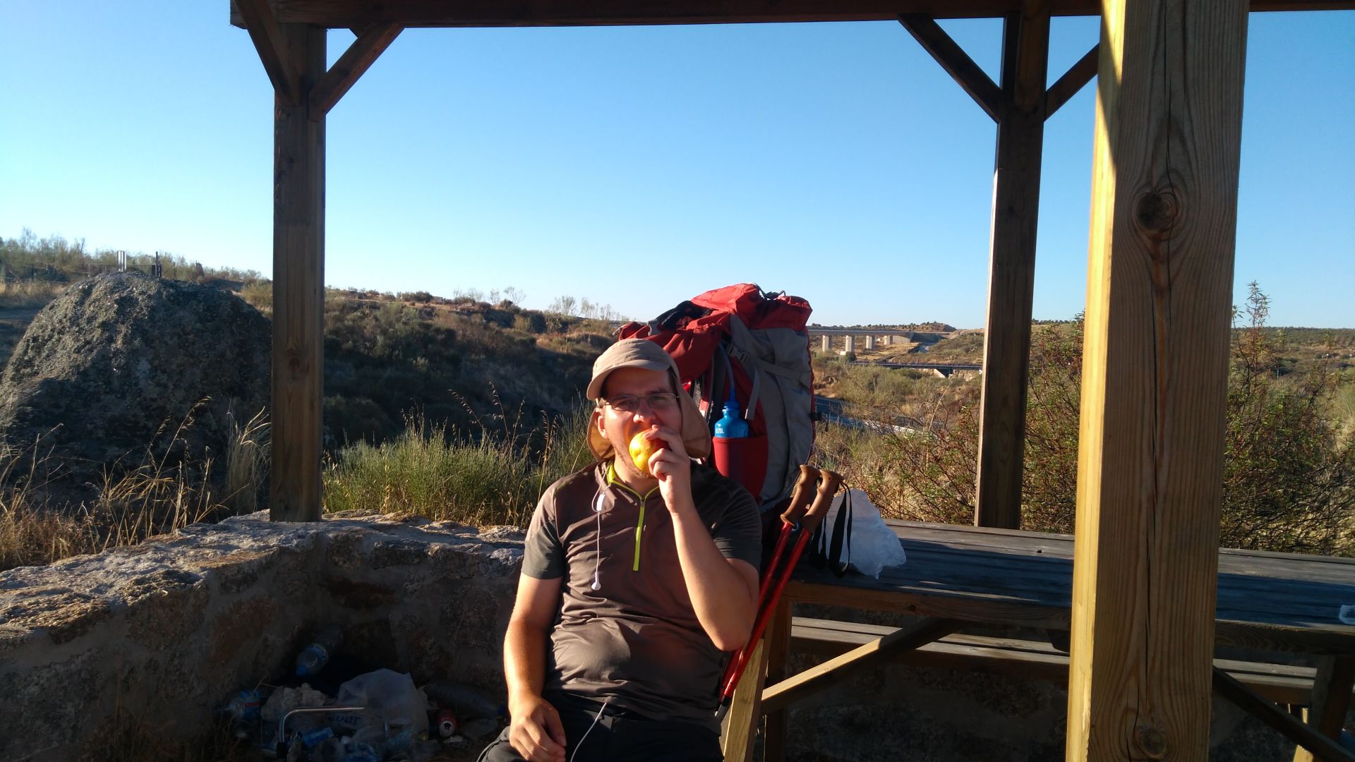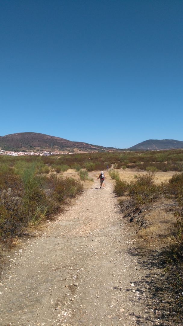 Danes smo vsi v albergu vstali skupaj okrog pol sestih, saj smo vsi vedeli da nas caka daljsa etapa. Tako sva na pot krenila ze ob 6.00 med zadnjimi, vendar to ni pomenilo veliko, saj smo danes vsi hodili z zelo podobnim tempom. Vsakic ko se je nekdo ustavil, so ga drugi prehiteli in skoraj ves cas si videl nekoga pred sabo. To se prejsnje dni ni dogajalo, tako da je bilo zelo nenavadno. Pot je bila vecinoma makadamska in je vodila mimo zanimivih skalnih skupkov. Le del mimo jezer je bil ob glavni cesti, saj je bilo treba preckati dva mostova. Tu gradijo nov most, camino pot pelje zelo blizu obeh koncev mostu, vmes pa kar dalec okoli. Morda je kdo mislil na uboge romarje in bo v prihodnosti pot peljala cez ta most? Na obstojecih mostovih ni nihce mislil na nas, saj je za dostop do pes poti cez most treba splezati cez ograjo. Pavel je mocno pogresal kavo, saj ni bilo ob poti prav nicesar. Ko se stevilo kilometrov pribliza 30, postane hoja vedno bolj naporna, se posebej ker ni nikjer vode ali sence, sonce pa ob 1h ze mocno zge. Tudi ko je cilj ze na vidiku je do tja vedno se presenetljivo dalec. Vode sva v ruzake nalozila malo vec in s previdnim doziranjem jo je bilo dovolj za celo pot. A kaj ko je na koncu tako topla kot bi jo pil s prijetno toplega bazena - tudi blag okus po kloru je prisoten. K sreci je prva hisa v vasi bar, kamor smo vsi zavili in si privoscili hladno pijaco.