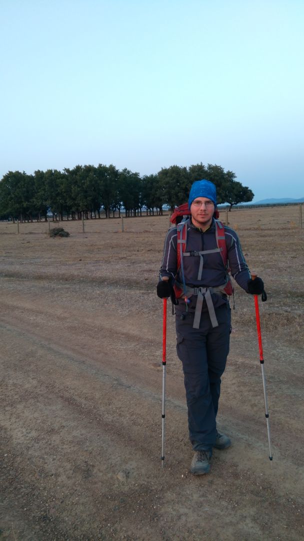 Spet sva odrinila sredi noci, hospitalijer je ze ob 6h pripravil zajtrk. Se v temi sva se skoraj izgubila, se dobro da je Pavel opazil da se je na levo odceil slabsi makadam, gps pa je potrdil da bo to prava pot. Vecino poti je bilo navzgor, pod vetrnicami ki so se vrtele nisva cutila nic vetra. Dosegla sva najvisjo tocko poti in pod krizem celo uspela uporabiti samosprozilec. Nato naju je cakala se druga polovica poti, zacelo se je navzdol, nato ma malo gor in malo dol. Vasi ni bilo ob poti nobene, sla pa sva mimo kmetije, kjer bi lahko prosila za vodo, a sva jo imela se dovolj - Pavel je bolj pogresal kavo. Na koncu je sonce ze spet kar toplo sijalo, tako da sva bila kar vesela, ko sva po 30km prispela v San Pedro. Tu naj bi bila polovica poti do Santiaga.