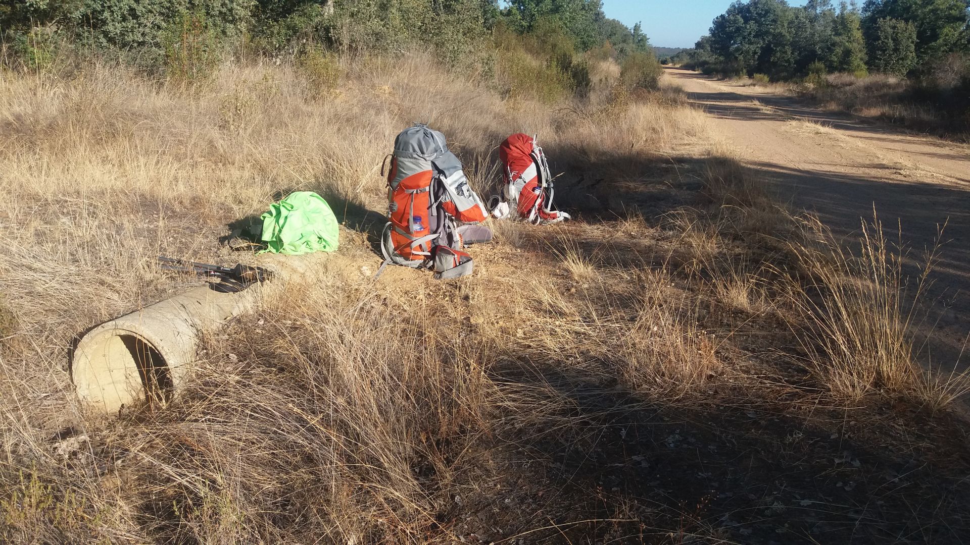 Danes v albergu ni bilo veliko smrcanja, ceprav nas je bilo 8 v sobi. Obvezno jutranje kuhanje caja in kave ter pospravljanje spalnih vrec, za to porabimo slabo uro ne pa 2 uri kot misli Petra. Zvezdno nebo brez oblacka, nato pa lahko kmalu ugasnemo naglavne svetilke in nadaljujemo pot v zarkih vzhajajocega sonca. Obdaja nas tisina in skripanje nasih korakov, vsak zatopljen v svoje misli se pocasi prebujamo. Ko sonce zacne malo greti, si lahko pricnemo slaciti kape, rokavice, sale in tudi puloverje. Danes pelje pot po gozdu kjer ni nikjer nobene klopce, tako pride za pocitek prav tudi cev v kanalu, ki je popolnoma izsusen in precej zarascen.