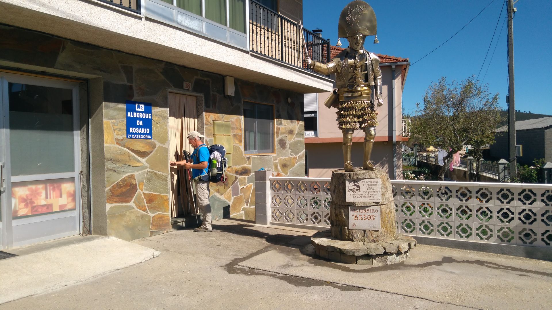 Domen in Pavel sta zadnje 2km tekla naprej in rezervirala zadnji dve spodnji postelji. Danes nas je toliko, da so morali postaviti dodatna dva pograda. V albergu so nas prehiteli s pranjem v pralnem stroju, zato smo vse oprali na roke. V relativno majhni sobi nas je natlacenih 17, kuhinje ali skupnega prostora pa tudi ni, zato gremo na kosilo v prvi bar in na kavo v drugega. Ta ima tudi edino "trgovino", ponujajo pijaco, piskote, madalenas, nekaj salame in lizike. V ponedeljkih kruha ne ponujajo, ker ni razvoza po vaseh. V prvem baru smo popoldne poskusili narociti sendvice, vendar je kuhinja do 9h zvecer zaprta.