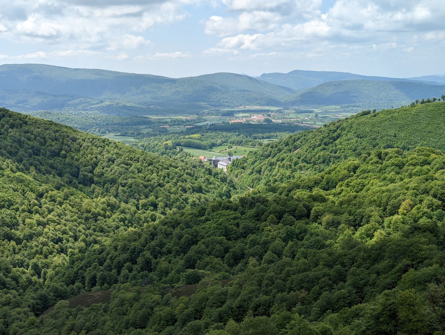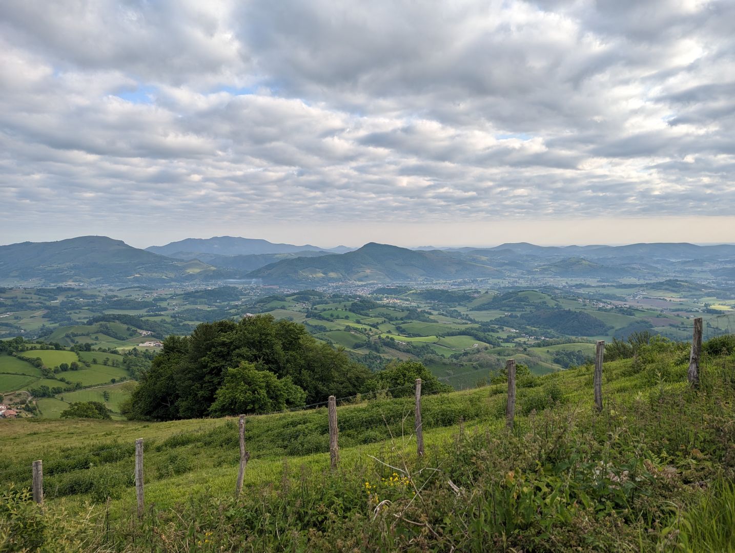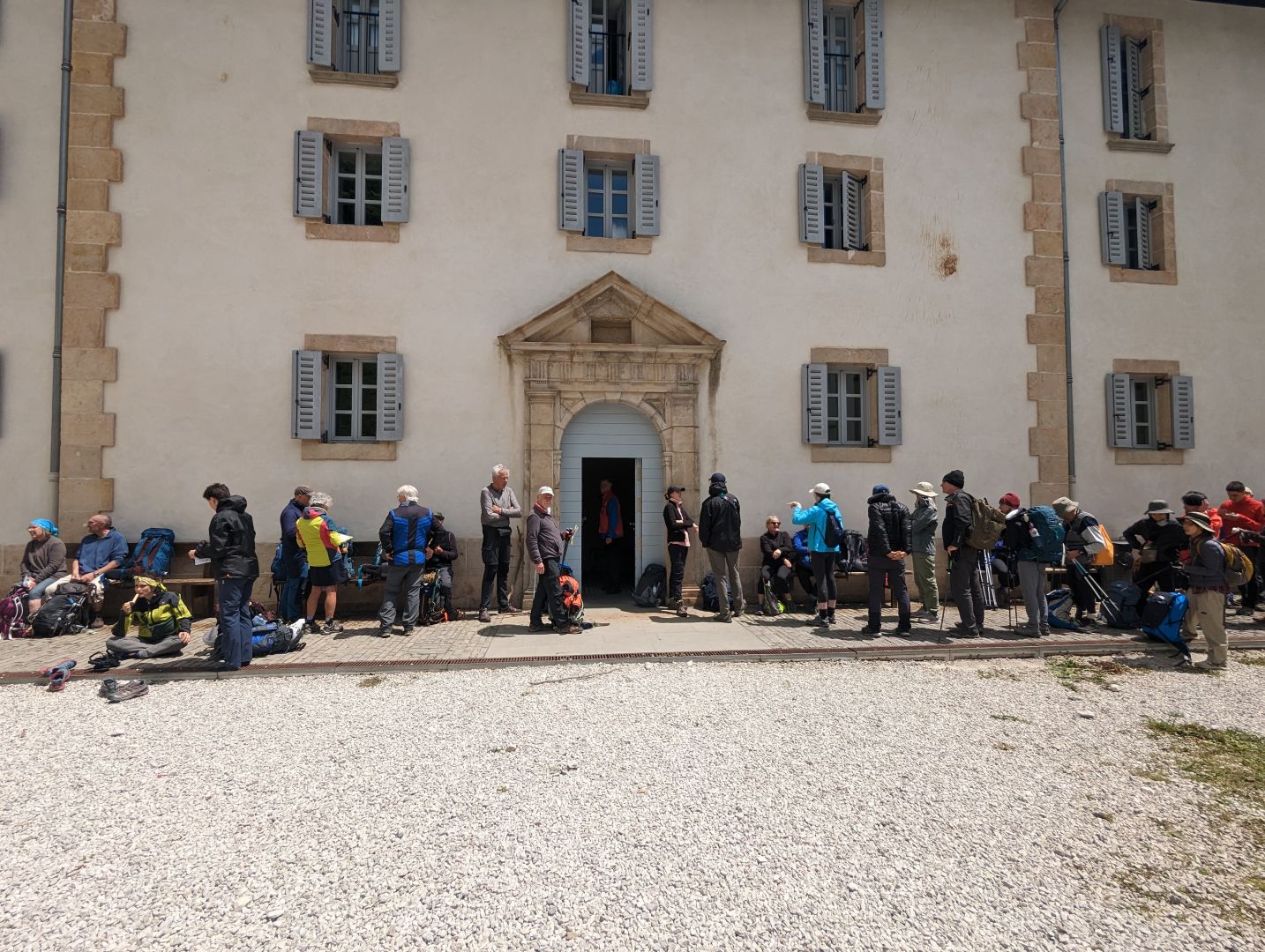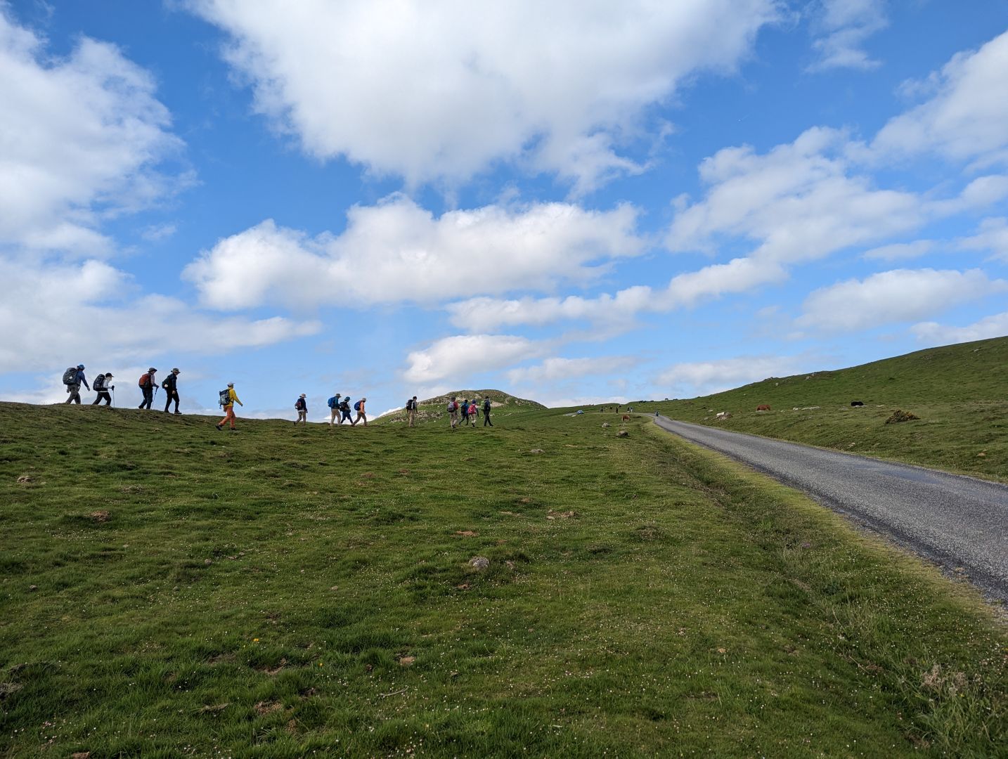 Zjutraj me je že ob 6ih zbudila močna reflektorska luč na stropu. Spakirala sva in se odpravila na pot. A ne prav daleč, že na prvem križišču sva našla odprt bar, kjer si je Pavel privoščil kavo, jaz pa francoski rogljiček in vročo čokolado. Potem pa sva začela vzpon. Pred nama je bilo 1200m višinske razlike - večinoma po asfaltirani cesti, le tu in tam malo peš poti. Romarjev je bilo ogromno, hodili smo skoraj v koloni. Mimo nas pa je pridrvel tudi kolesar z električnim kolesom.