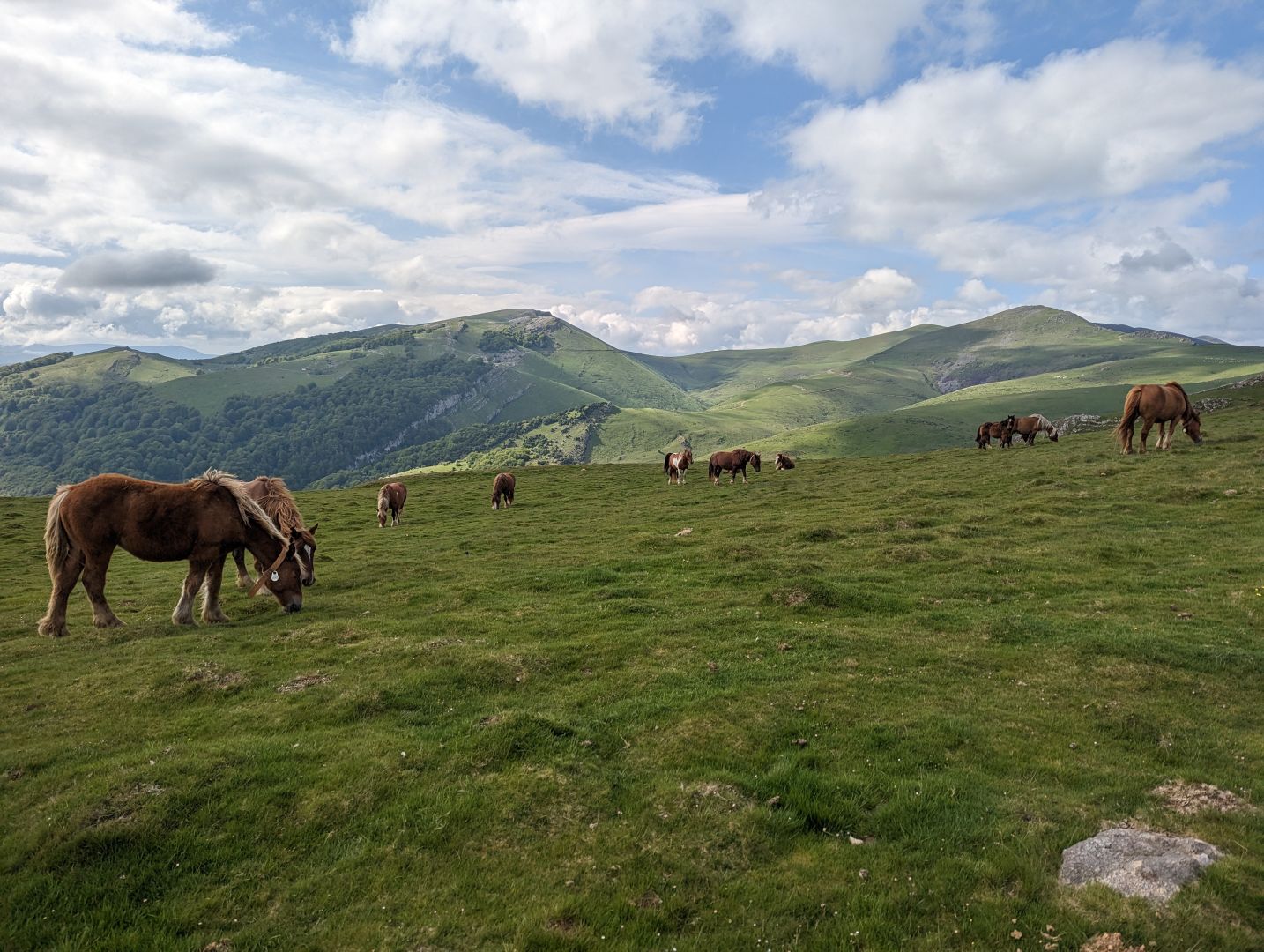 Po 8 km je zadnji alberg/bar. Tu sva si dotočila vode in privoščila sendvič. Na obeh straneh poti so se razprostrirali travniki, na katerih so se pasle krave, konji in ovce. S premaganimi višinskimi metri se je vedno bolj krepil veter, tako da sva si oblekla vetrovke, kasneje pa še rokavice. Na koncu pa še spust v Roncesvalles. Tu sva še prez problema dobila prenočišče, ker sva bila precej zgodnja in ima alberg več kot 200 postelj. Tu so 3 skrbeli da smo bili v vrsti pravilno razporejeni, registracijo v alberg pa je opravljal samo eden, tako da je postopek kar trajal. Nisem prepričan ali so zdaj že končali, preden sem se lotil pisanja je bila še kar velika gužva. Danes imava v albergu ob 7h večerjo in jutri zajtrk, tako da nama tudi za hrano ni treba skrbeti.