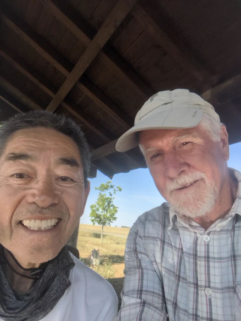 Kot se vidi na prvi fotografiji sem tudi danes odšel pred sončnim vzhodom, ker je eden vstal kmalu po 4h, druga dva pa po 5h. Potem tudi jaz nisem mogel več spati. Danes je bila pot prijetna, ker je ponoči deževalo, potem pa je bilo 25 km drevoreda, ki že daje senco. Japonca sem v prvi vasi že dohitel, in sva naredila selfi. Naučil me je reči hvala(arigato). Včeraj pa sem ga opazoval, kako se je ob sončnem vzhodu priklanjal soncu.