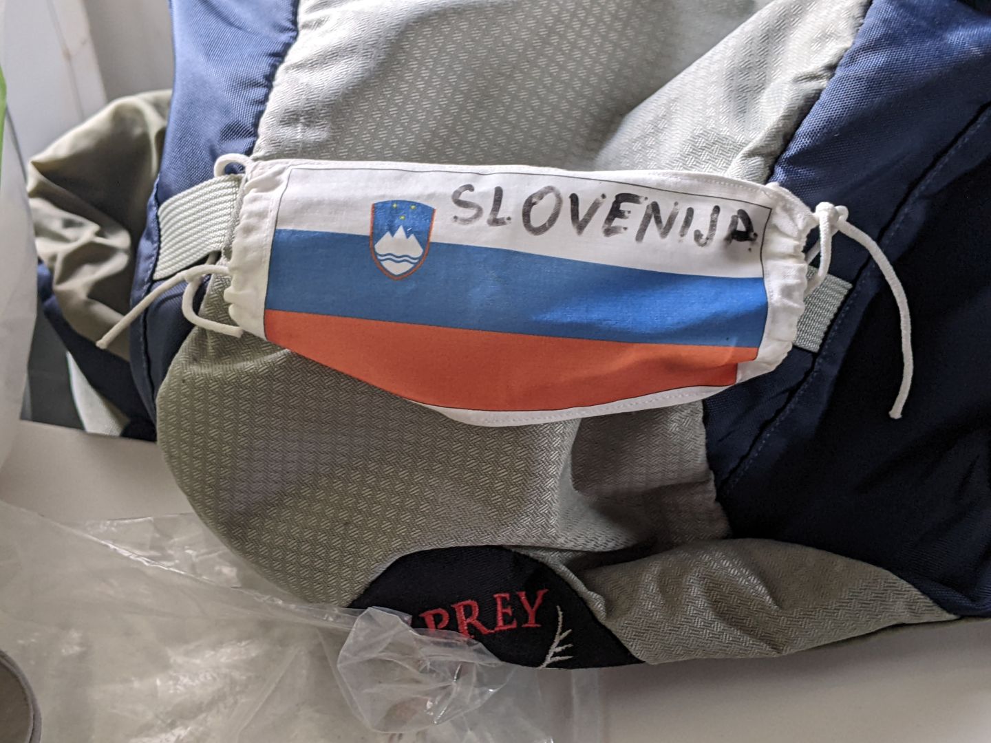 Ker je bila Bredi všeč moja dogodivščina, vam povem še eno. Ko sva z Domnom prišla v Pamploni, sva se ustavila v župnijskem albergu. Ker alberg še ni bil odprt, smo čakali v vrsti. Med romarji je bil tudi Američan, ki je ravno prispel in bi začel pot v Pamploni. Zanimalo ga je veliko stvari, potem si je pa nekaj časa ogledoval moj nahrbtnik.(glej zadnjo sliko). Ves zaskrbljen me je vprašal, če je še vedno treba imeti masko proti covidu. Potolažil sem ga, da to ni maska, ampak slovenska zastava.