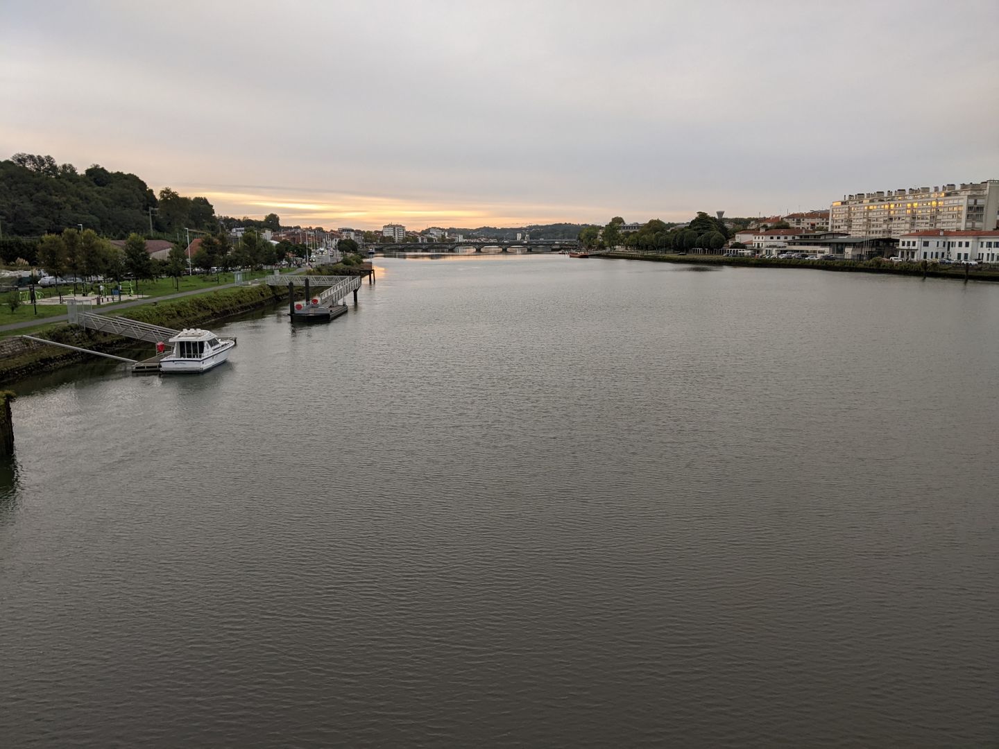 Kot običajno eni ne morejo spati, zato smo vsi vstali zgodaj. Odšel sem, ko se je zdanilo. Najprej čez reko Adour do katedrale, kjer naj bi se začel kamino. Nisem našel nobenih oznak, zato sem šel naprej ob reki Nive. Čez nekaj časa se je pojavila oznaka za oba kamina. Pot je ves čas ob reki kot sprehajalna in kolesarska pot, zato sem srečal ogromno kolesarjev in tekačev. Prehitel me je le en romar, ki pa je odšel še naprej.