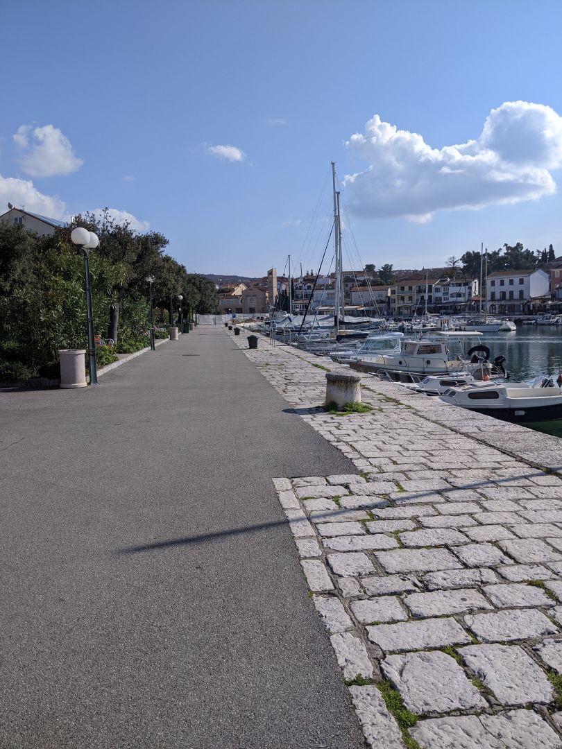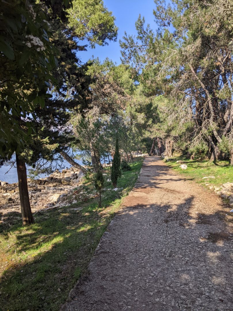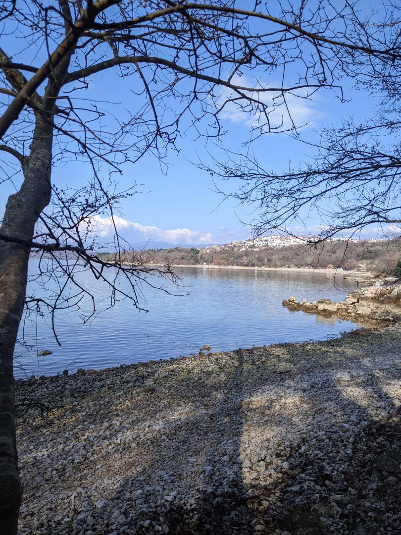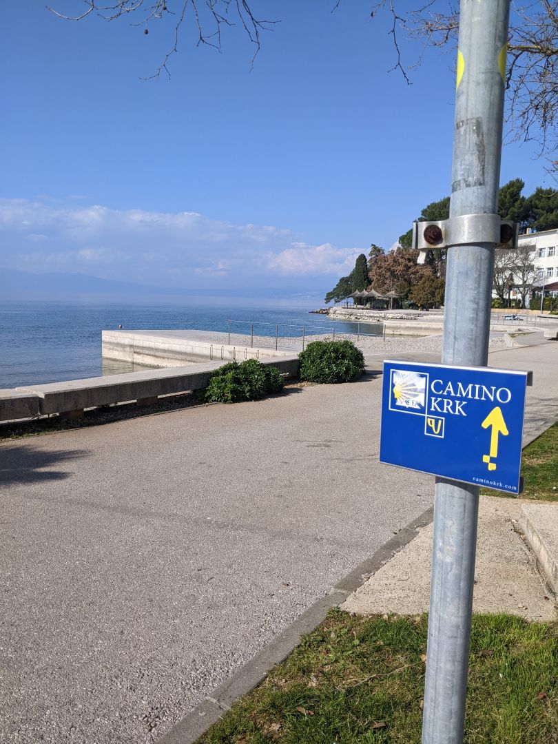 Danes smo spet zaceli pot po caminu na Krku.Pavel in jaz hodiva Domen, pa je najin taxist. Nastanjeni smo v Cizicih. Pot poteka okoli Krka v smeri urinega kazalca.Pavel naj bi prehodil vse etape jaz pa polovico vsake, tako, da bo imel se najvec dela Domen, da naju bo dostavljal na start in cilj posamezne etape.To je najino praznovanje zlate poroke. Danes sva v popoldanskih urah prehodila del od Malinske do Njivic. Pot poteka vecji del ob obali in je dobro oznacena. Prelepi pogledi so naju spre;ljali vso pot. Kljub soncu, se ni vrocine,zato sva prav uzivala.